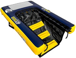 Es una plataforma hinchable que tiene una rampa con tres peldaños que quedan bajo el agua. La rampa tiene dos posiciones para adaptarse al tamaño del perro y está diseñado en azul y amarillo que son los colores que mejor distinguen los perros debido a su visión dicromática.