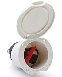 Fabricado en policarbonato negro. Fijación por tuerca. Cuerpo de acero inoxidable AISI 316, Montaje de collar con tuerca de doble rosca. Muy resistente. Equipado con capuchón de PVC estanco y llave de latón niquelado antisalpicaduras.