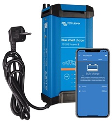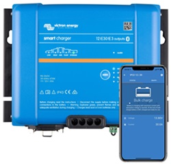 Nuevo cargador de baterías Victron Phoenix Smart IP 43 12/30 con 3 salidas de corriente completa para cargar 3 bancadas de baterías. El cargador Phoenix Smar IP 43 utiliza la convección natural para refrigerarse y posee Bluetooth habilitado desde donde podrá controlar el cargador y programar alarmas directamente desde el teléfono.