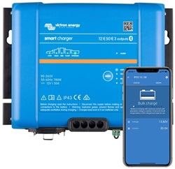 Nuevo cargador de baterías Victron Phoenix Smart IP 43 12/50 con 3 salidas de corriente completa para cargar 3 bancadas de baterías. El cargador Phoenix Smar IP 43 utiliza la convección natural para refrigerarse y posee Bluetooth habilitado desde donde podrá controlar el cargador y programar alarmas directamente desde el teléfono.