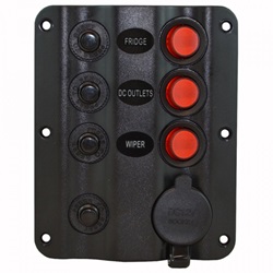 Modelo 4P + Tomas. 4 interruptores (2x5A, 1x10A y 1x15A) con magnetotérmico, 1 toma USB doble y 1 toma de 12v. Dimensiones Exteriores: 180x100 mm. Dimensiones Interiores: 160x82 mm