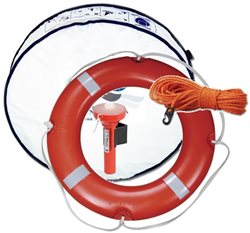 Servido con: aro salvavidas de 75cm o 60cm, funda blanca, rabiza flotante de 30m y luz flotante LED.