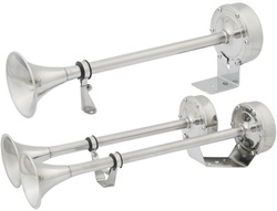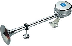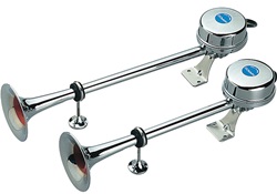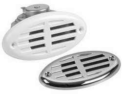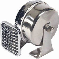 Rejilla en ASA y abrazadera en acero. Sonido grave, típicamente náutico. Rápida instalación. Apta para embarcaciones de trasporte, profesionales, yates bajo 12 m, dragadoras y botes.
