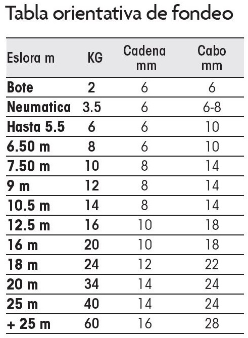 Para elegir el ancla adecuada, puede consultar la Tabla Orientativa de Fondeo