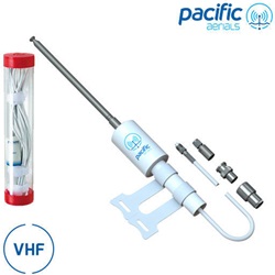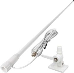 Antena de fibra de vidrio marina de VHF 156 - 162 Mhz incluye soporte articulado para instalación en cubierta, tiene una longitud de 160 Cm e incluye 4 mts aprox de cable RG-58 con conector PL incluido y soporte de montaje.